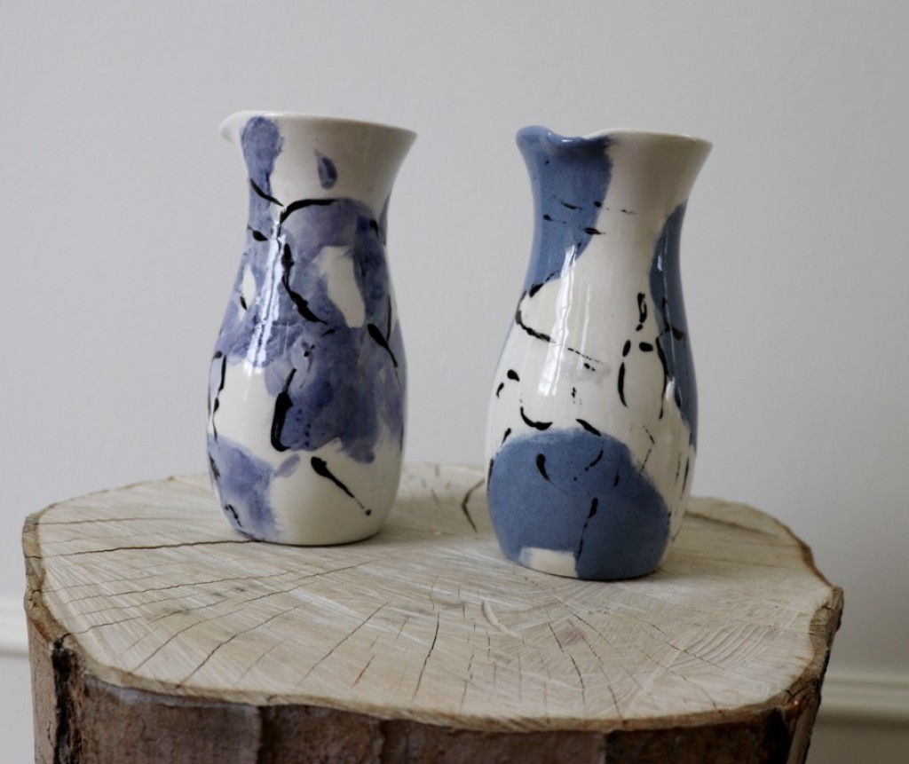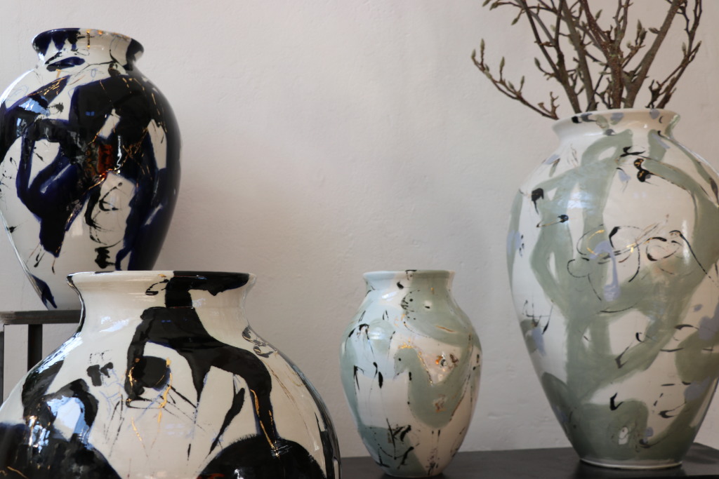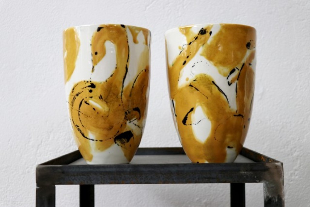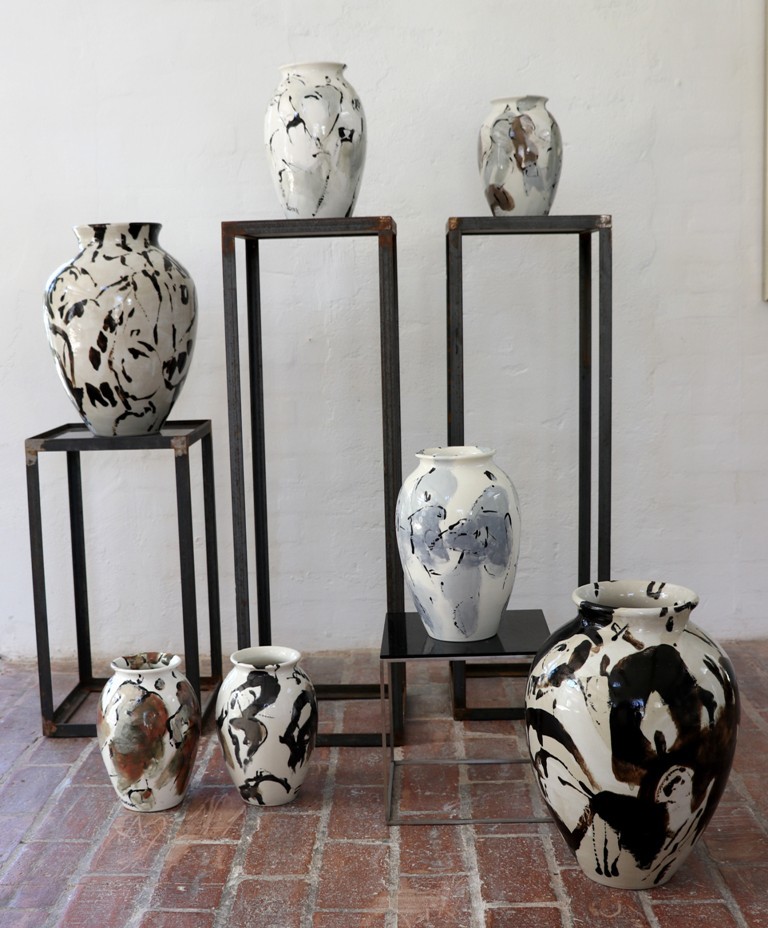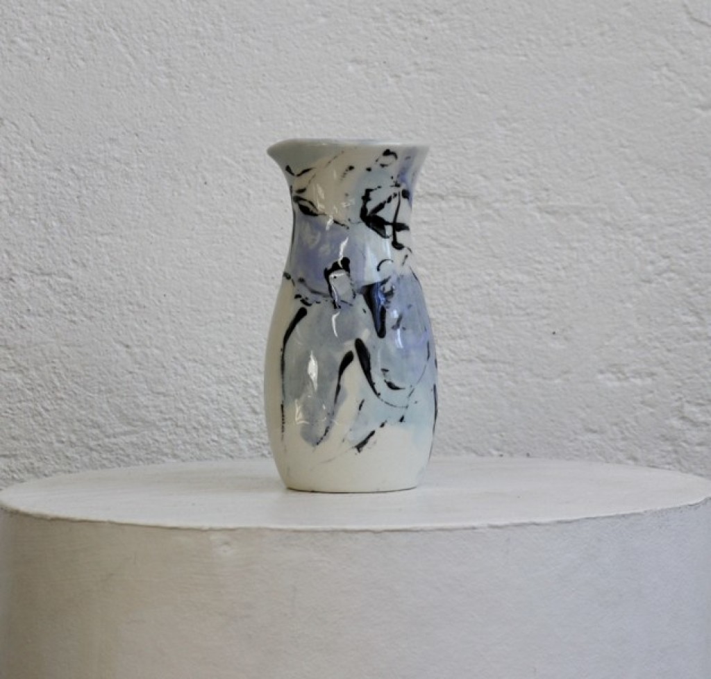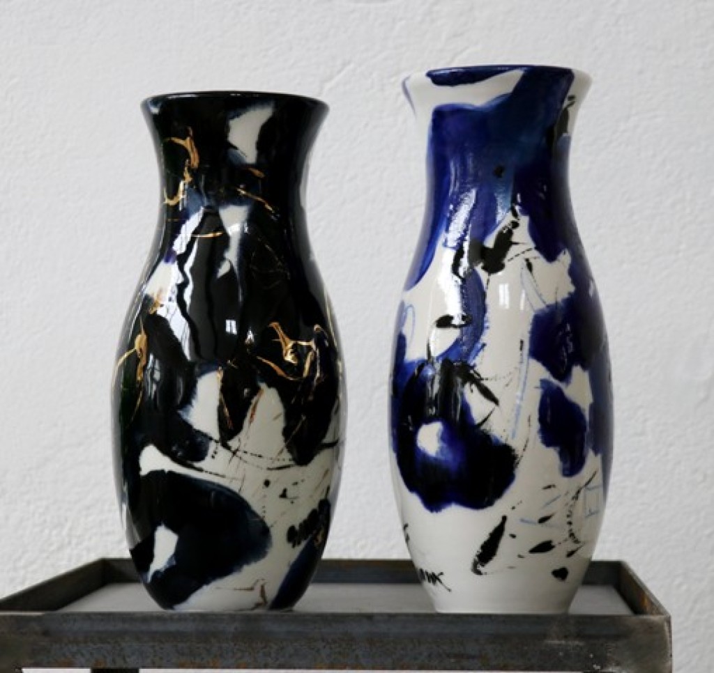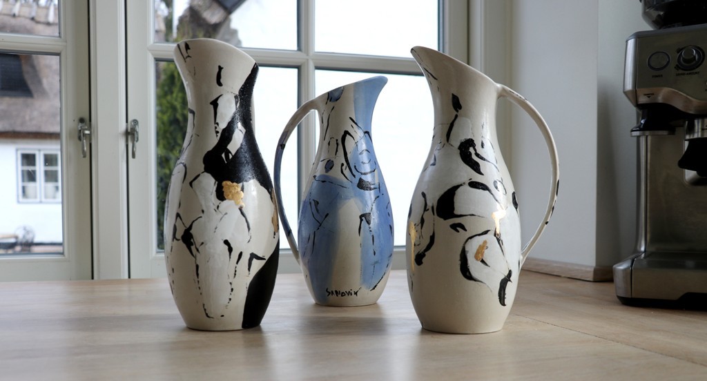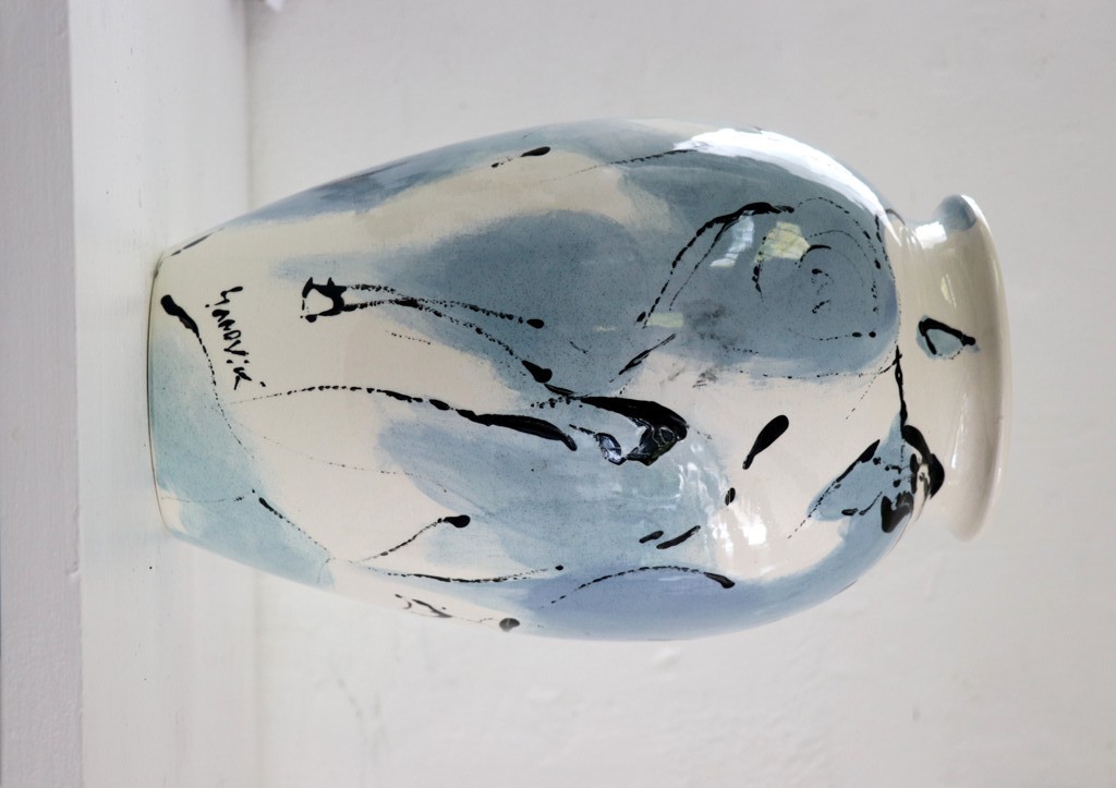 At lege med leret, og få de abstrakte former fra malerierne ind i lerskulpturene er en sjov og udfordrende opgave. Jeg arbejder både i lertøj og stentøj og alt er unika. Jeg bruger mine abstrakte motiver fra malerierne på vaser, kopper, skåle, skulpturer mv.
