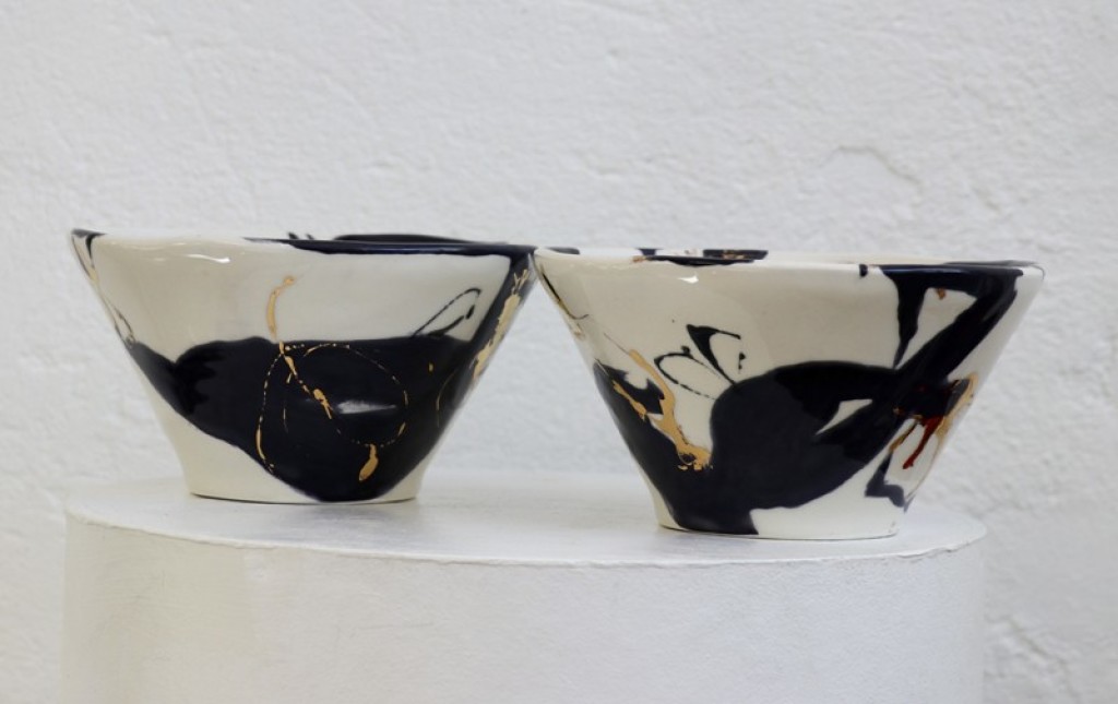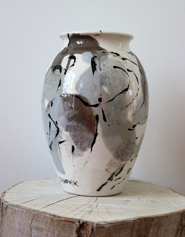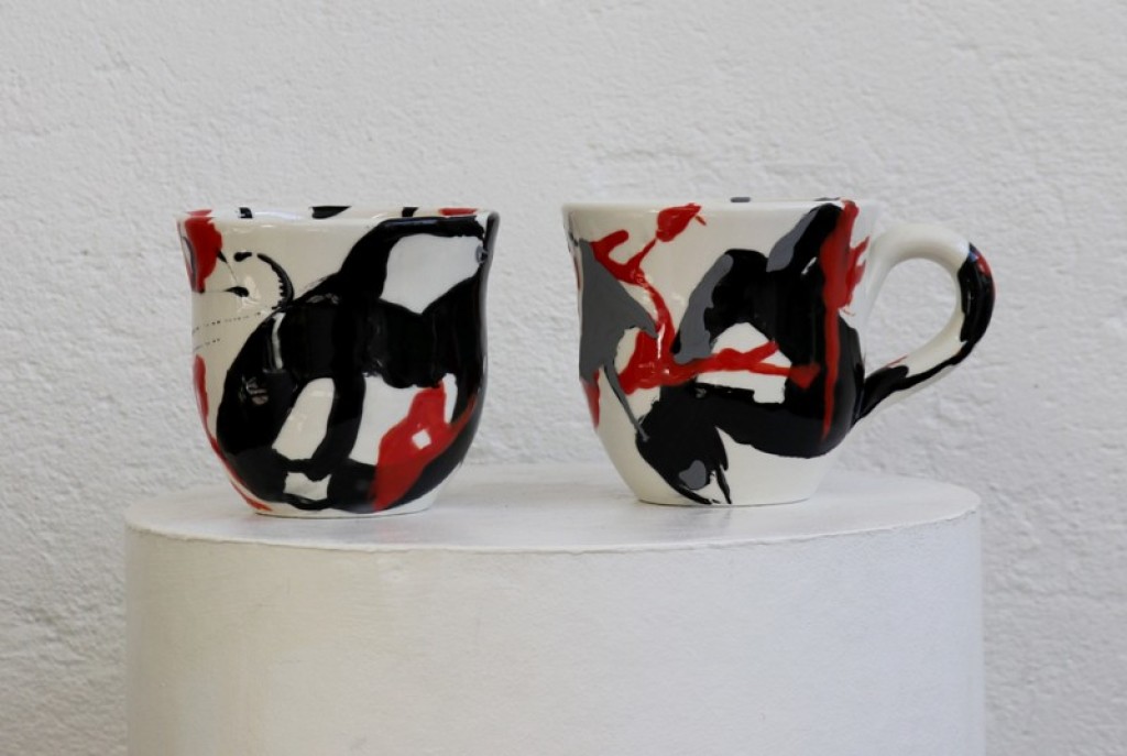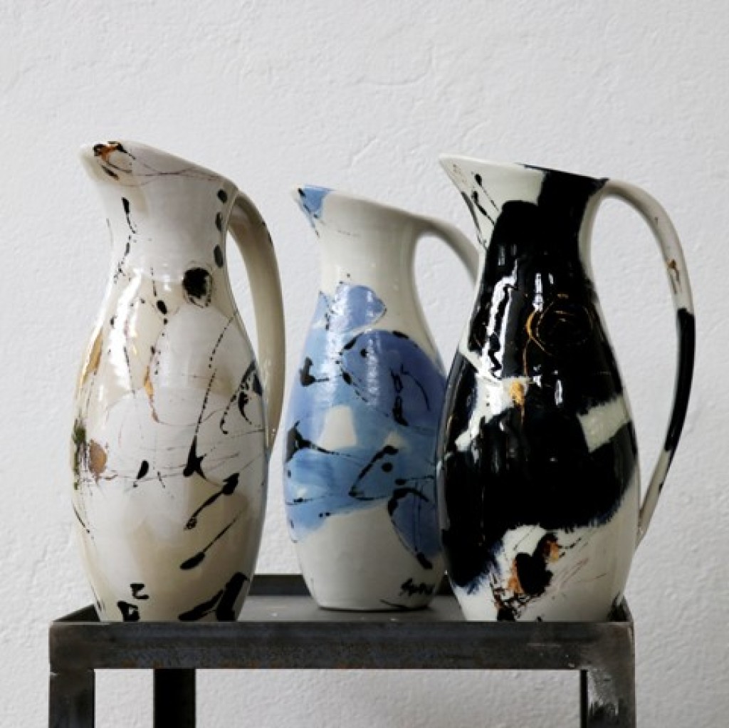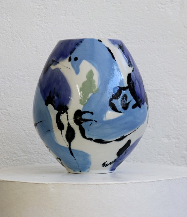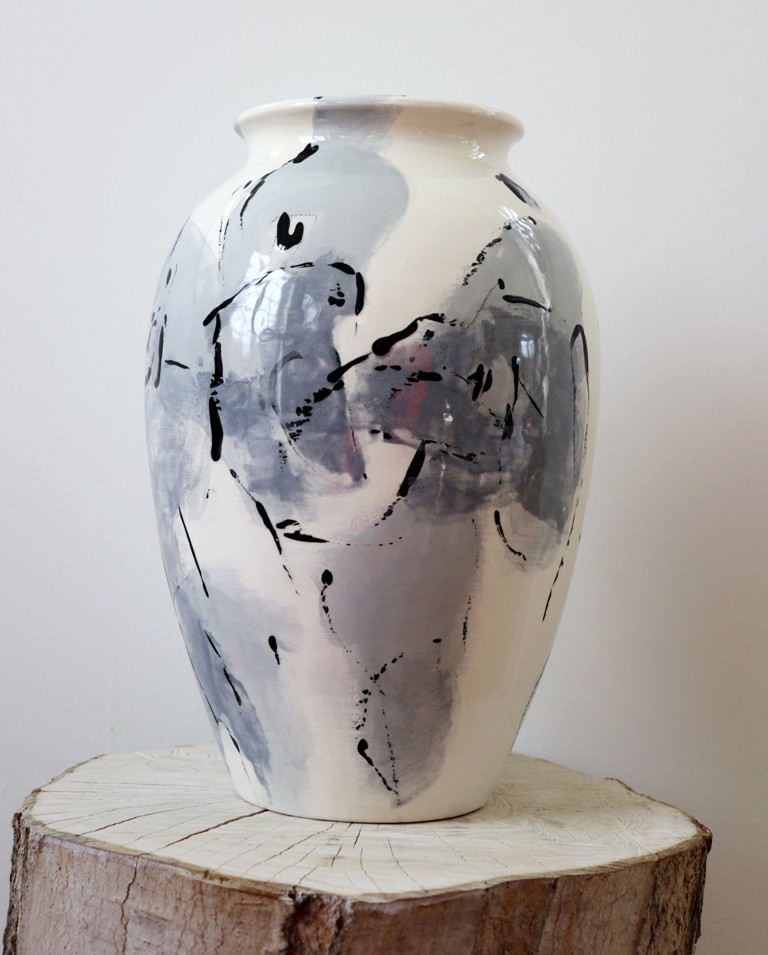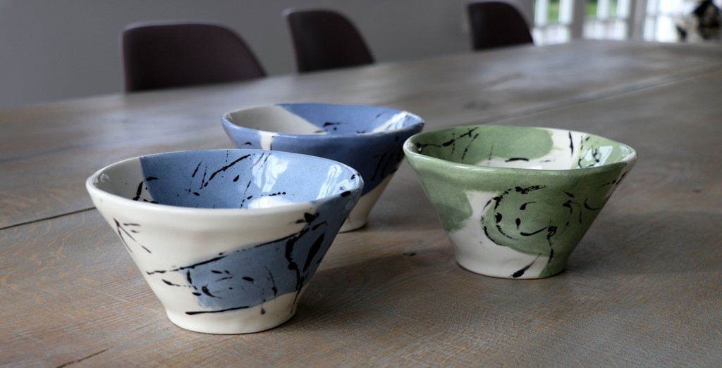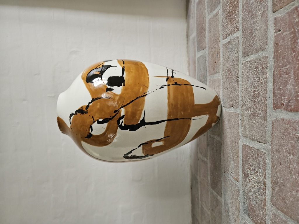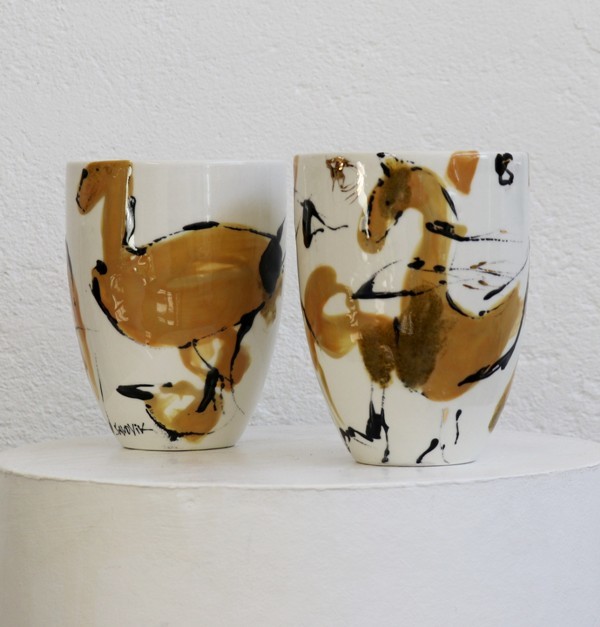 At lege med leret, og få de abstrakte former fra malerierne ind i lerskulpturene er en sjov og udfordrende opgave. Jeg arbejder både i lertøj og stentøj og alt er unika. Jeg bruger mine abstrakte motiver fra malerierne på vaser, kopper, skåle, skulpturer mv.
